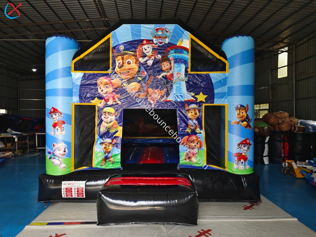 Professionelle aufblasbare Sprungburg mit Paw Patrol-Thema in schwarzen und blauen Farben, speziell für kommerzielle Zwecke und Kinderunterhaltung konzipiert.