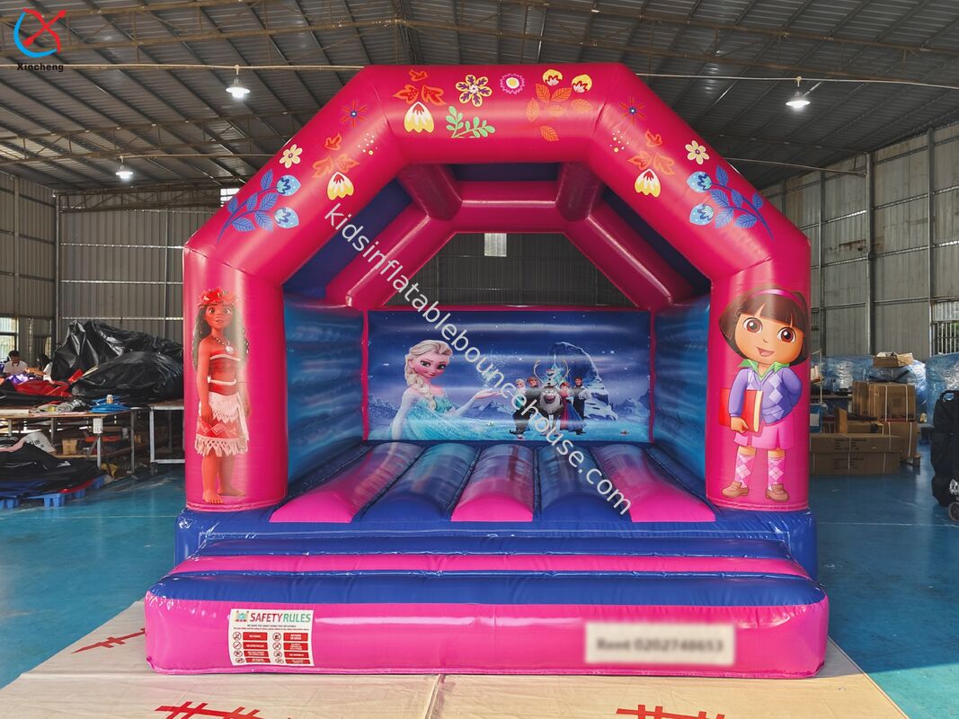 Professionelles aufblasbares Sprunghaus mit einem pulsierenden rosa Prinzessin-Thema, speziell für kommerzielle Nutzung und Unterhaltung für Kinder konzipiert.