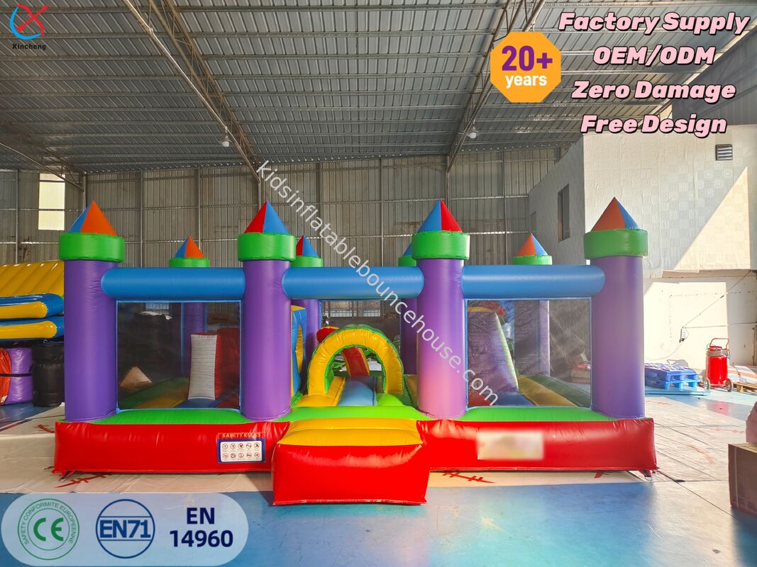 Dieses pulsierende aufblasbare Schloss in Regenbogenfarbe verfügt über ein Mehrturm-Design mit Hindernisbahn und Rutsche für kontinuierliches aktives Spiel und Unterhaltung.