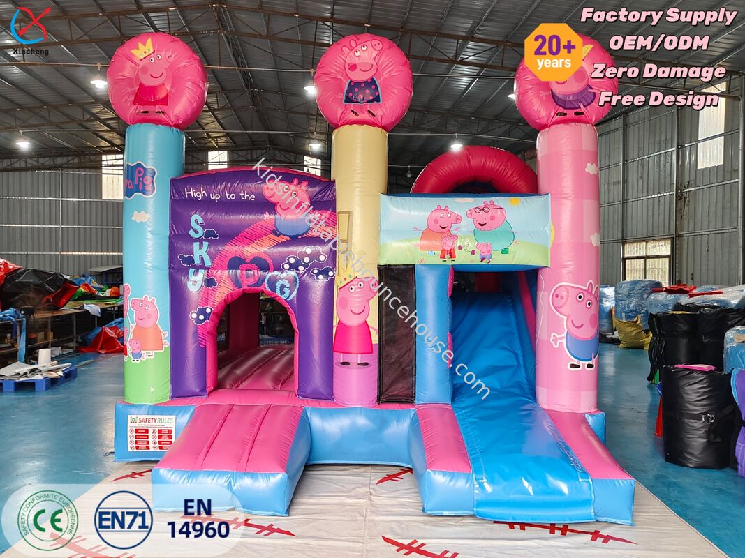 Dieses aufregende aufblasbare Sprunghaus mit dem Thema Peppa Pig verfügt über lebendige Grafiken und eine lustige Rutsche, die ein immersives Spielerlebnis für Kinder schafft.Die robuste Konstruktion sorgt für sicheres Springen und Gleitvergnügen bei Partys und Veranstaltungen.